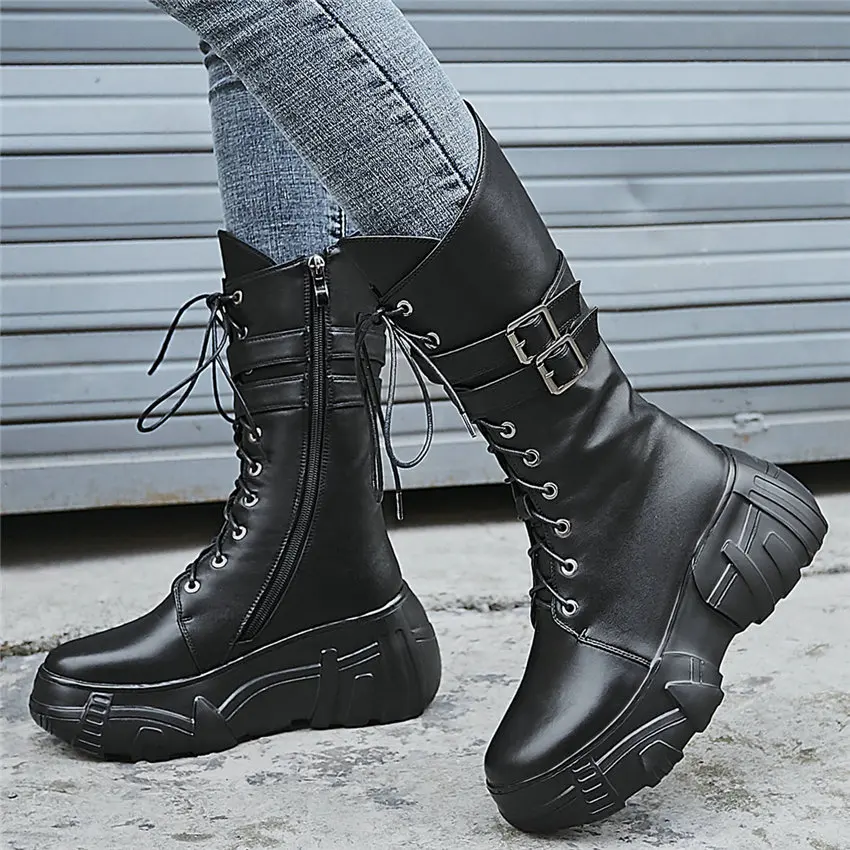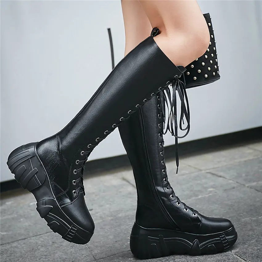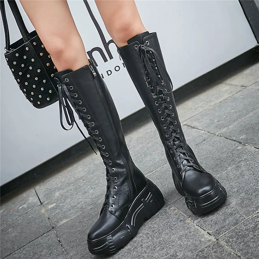 Women Lace Up Cow Leather Wedges Knee High Military Riding Boots Round Toe High Heel Platform Oxfor