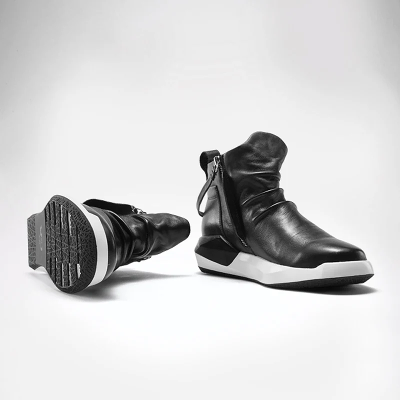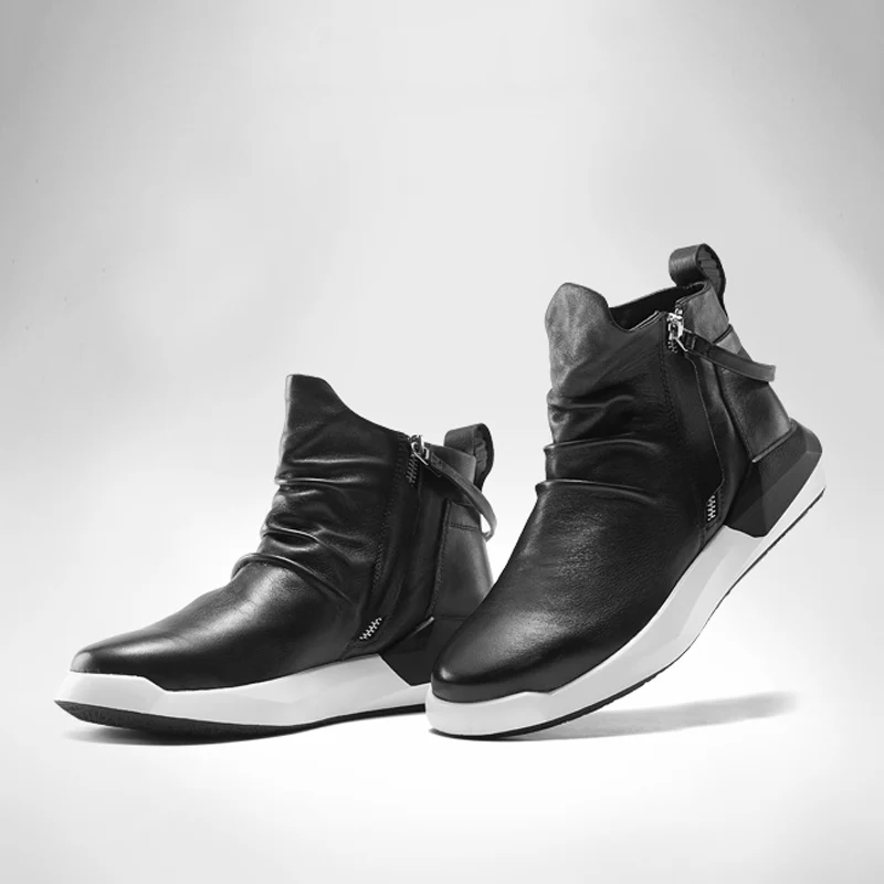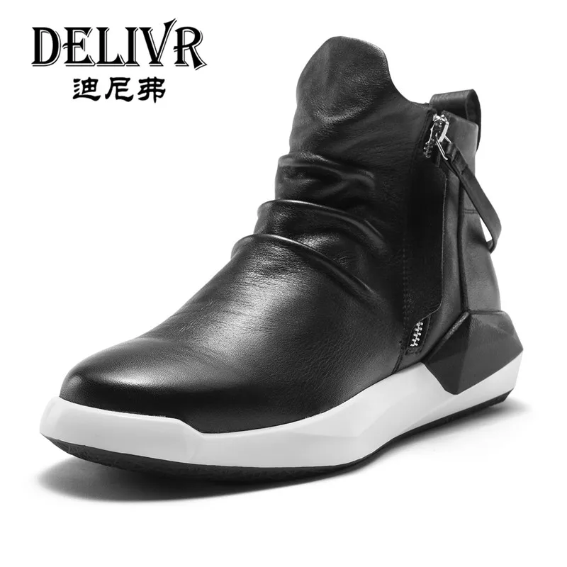 Delivr Genuine Leather Boots Men Black Fashion Real Leather Men Shoes Sneakers Flats Zipper Men Sho